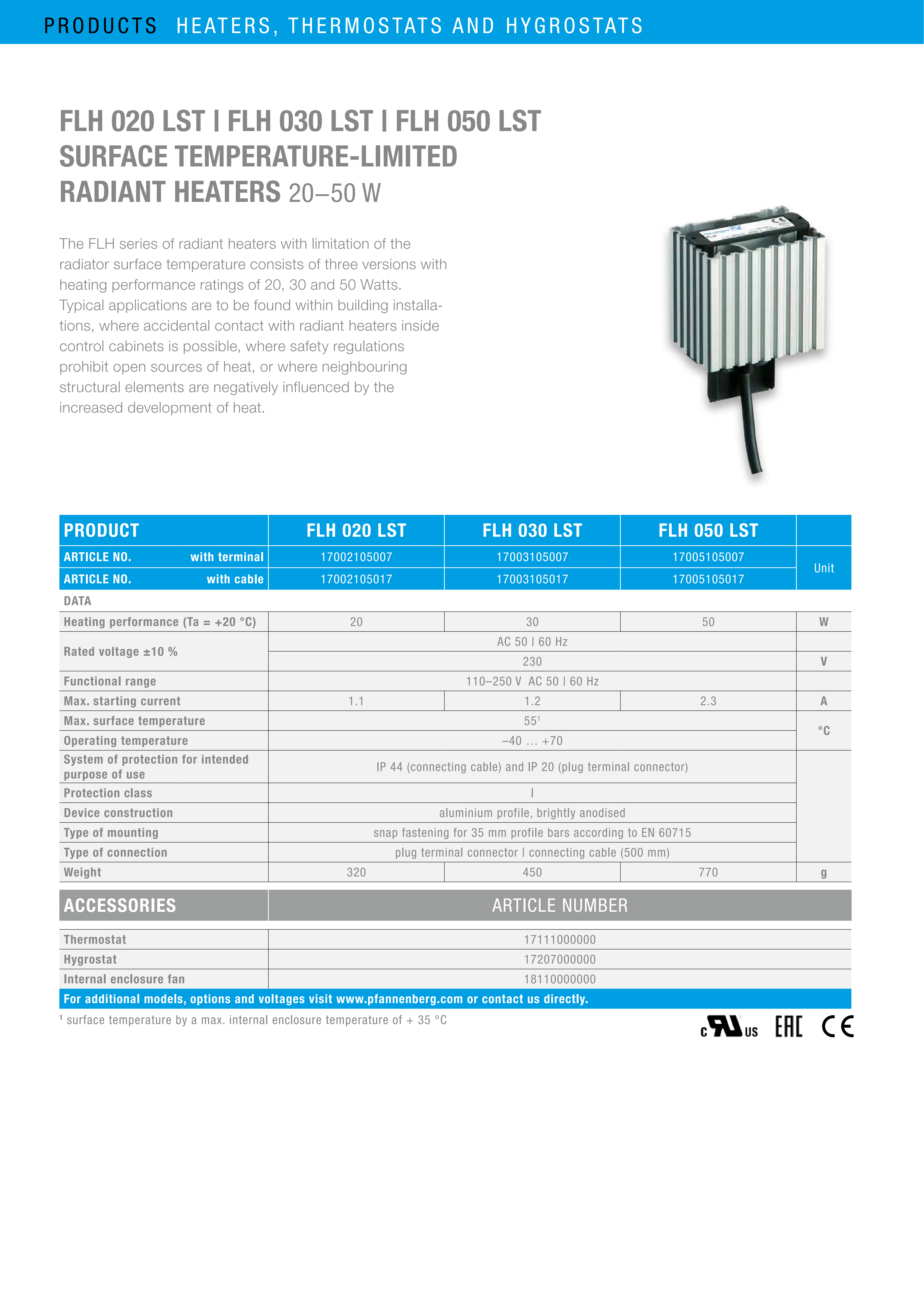 FLH系列低表面温度辐射加热器有3种规格,分别是20W,30W,50W。该系列加热器常应用于维护结构内安装,适用于以下环境:在有可能触碰加热器的情况下在存在控制柜内辐射加热器的环境中在严禁开放热源的环境中在热量会对周边电气元件造成不良影响的环境中